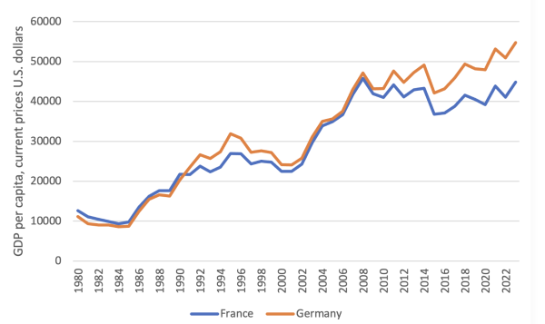 La richesse produite par habitant en France stagne en effet depuis la crise de 2008 et, dans le classement mondial sur cet indicateur, la France perd continûment des places : elle se classe aujourd’hui en 24e position, alors qu’elle occupait la 11e place dans les années 1990. La figure 1 montre que le décrochage avec notre voisin allemand (lui-même pas si bien placé, en 17e position) n’a fait que s’accentuer depuis 2008. Au regard de sa population, la France produit moins de richesses que le plus grand nombre des pays développés. On en connaît bien une des raisons principales : avec un taux d’emploi global relativement plus faible et une durée du travail par personne en emploi moins élevée, la France présente la quantité de travail par personne en âge de travailler parmi les plus faibles d’Europe. C’est l’une des raisons pour lesquelles le PIB par habitant a décroché.